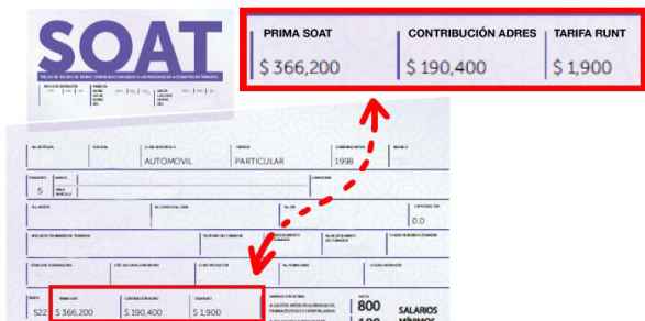 • $558.500 es el valor total del Seguro Obligatorio SOAT, de los cuales $366,200 corresponden al valor de la prima SOAT, $190.400 a la contribución ADRES y $1.900 van al RUNT. Por consiguiente, de aplicarse el 10 % de descuento a la prima SOAT, este quedaría así: