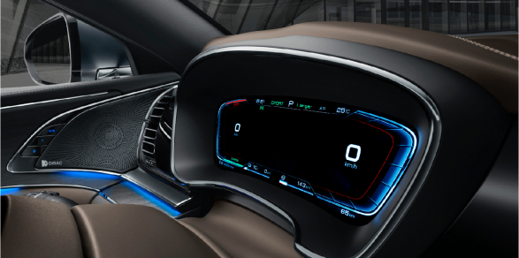 Su equipamiento es acorde con el concepto de elegancia y confort que lo caracterizan. La luz ambiental se extiende desde el techo a las puertas. En el tablero se encuentra el centro de control, con palanca de mando ergonómico que cambia de tono (azul o rojo) según el modo de manejo (eco, sport). Este carro incorpora una pantalla para la instrumentación LCD de 12.3 pulgadas y una pantalla multimedia giratoria de 15.3 pulgadas, para mayor facilidad de lectura de mapas en posición vertical, entre otros.