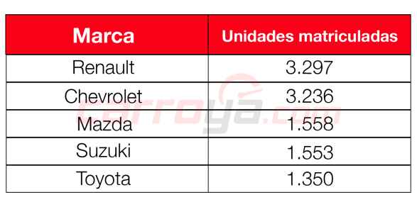 1. Renault: 3.297 unidades, 2. Chevrolet: 3.236 unidades, 3. Mazda: 1.558 unidades, 4. Suzuki: 1.553 unidades, 5. Toyota: 1.350 unidades.