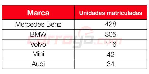 1. Mercedes Benz: 428 registros, 2. BMW: 305 registros, 3. Volvo: 116 registros, 4. Mini: 42 registros, 5. Audi: 34 registros.