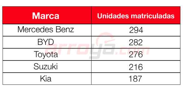 1. Mercedes Benz: 294 vehículos, 2. BYD: 282 vehículos, 3. Toyota: 276 vehículos, 4. Suzuki: 216 vehículos, 5. Kia: 187 vehículos.