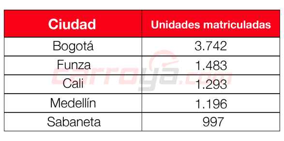 1. Bogotá: 3.742 matrículas, 2. Funza: 1.483 matrículas, 3. Cali: 1.293 matrículas, 4. Medellín: 1.196 matrículas, 5. Sabaneta: 997 matrículas.