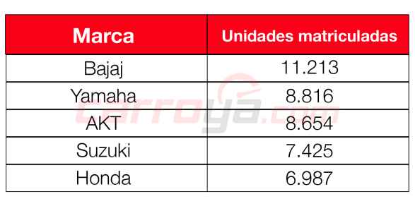 1. Bajaj: 11.213 motos, 2. Yamaha: 8.816 motos, 3. AKT: 8.654 motos, 4. Suzuki: 7.425 motos, 5. Honda: 6.987.