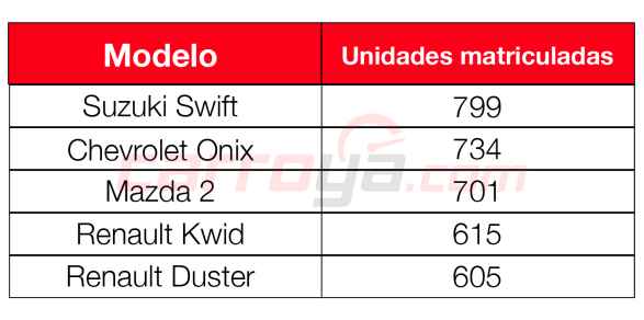 1. Suzuki Swift: 799 ventas, 2. Chevrolet Onix: 734 ventas, 3. Mazda 2: 701 ventas, 4. Renault Kwid: 615 ventas, 5. Renault Duster: 605 venttas.