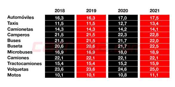 Cabe resaltar que por segmento, los vehículos livianos (automóviles, taxis, camperos y camionetas) registraron una edad promedio de 17,1 años, mientras que los vehículos transporte de pasajeros (buses, busetas, microbuses) obtuvieron una edad media de 20,8 años y los vehículos de carga (camión, tracto camión y volqueta) registran una edad media de 21,6 años.