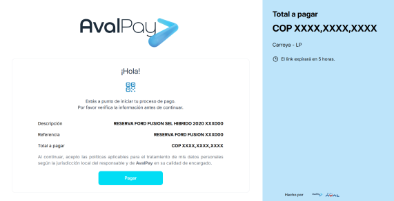 Una vez hayas confirmado con tu asesor el vehículo que deseas separar, recibirás un enlace de pago personalizado a tu correo electrónico. Este enlace, generado por AvalPay, te permitirá realizar el pago de separación de forma segura y directa. Ten en cuenta que el enlace tiene una vigencia, por lo que es importante realizar el pago dentro de ese plazo para asegurar tu reserva.