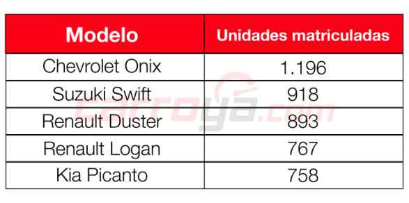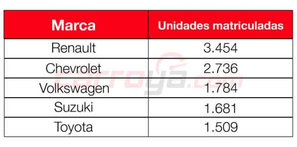 1. Renault: 3.454 unidades (-14.1 %), 2. Chevrolet: 2.736 unidades (-23.5 %), 3. Volkswagen: 1.784 unidades (67.4 %), 4. Suzuki: 1.681 unidades (173.8 %), 5. Toyota: 1.509 unidades (16.8 %).