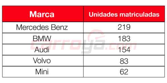 1. Mercedes Benz: 219 carros (-12.7 %), 2. BMW: 183 carros (-37.8 %), 3. Audi: 154 carros (18.5 %), 4. Volvo: 83 carros (-21,7 %), 5. Mini: 62 carros (26,53 %).