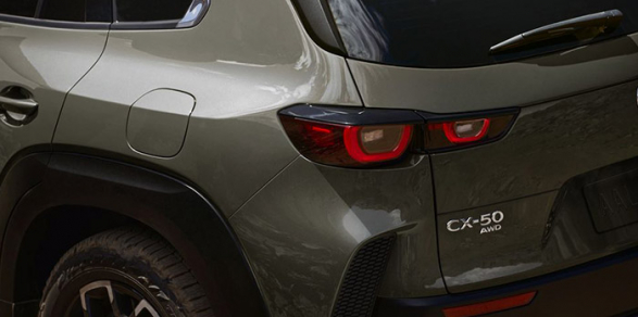 En su parte exterior, la Mazda CX-50 presenta una nueva parrilla frontal con rebordes cromados o en negro brillante (según la versión), que parece mezclarse con el grupo óptico delantero, gracias a su diseño alargado hacia los costados que la hace ver mucho más refinada. Además, hay presencia de luces LED en faros y direccionales del bumper delantero, un aplique en negro mate sobre el capó con la inscripción CX-50, entradas de aire que mejoran su coeficiente aerodinámico y un Ski Plate cromado bajo el parachoques.