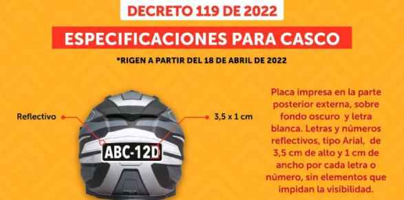 La normativa de la nueva señalización de la placa en cascos, que iniciará este 18 de abril, exige que tanto conductor como acompañante lleven en la parte trasera de los cascos las letras y números en color blanco reflectivo sobre un fondo negro con borde blanco para optimizar su visibilidad. El decreto además aclara que la tipografía de las letras deberá ser tipo arial y su tamaño (por letra y número) de 3.5 centímetros de alto y de un centímetro de ancho, sin elementos adicionales que impidan su reconocimiento.