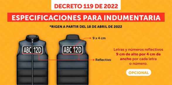 La secretaría de Movilidad de Bogotá también informó que la aplicación del número de la placa en chalecos y otras indumentarias será opcional, pero de portarse, deberá cumplir con un estándar mínimo de 9 centímetros de alto por 4 centímetros de ancho por cada carácter, y de igual manera aplicado sobre fondo negro con borde y letras blancas reflectivas en la zona delantera y trasera de la prenda.