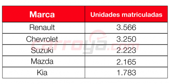 1) Renault: 3.566 unidades vendidas, 2) Chevrolet: 3.250 unidades vendidas, 3) Suzuki: 2.223 unidades vendidas, 4) Mazda: 2.165 unidades vendidas, 5) Kia: 1.783 unidades vendidas.