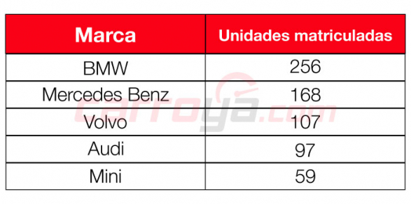 1) BMW: 256 vehículos registrados (11,3 %), 2) Mercedes Benz: 168 vehículos registrados (- 29.1 %), 3) Volvo: 107 vehículos registrados (-5.3 %), 4) Audi: 97 vehículos registrados (-17,8 %), 5) Mini: 59 vehículos registrados (0 %).