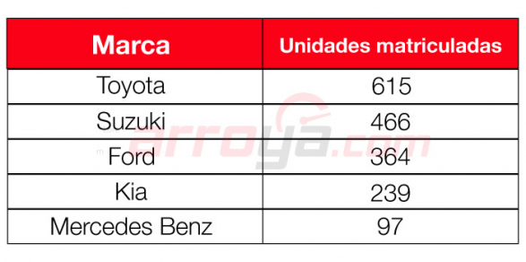 1) Toyota: 615 carros matriculados, 2) Suzuki: 466 carros matriculados, 3) Ford: 364 carros matriculados, 4) Kia: 239 carros matriculados, 5) Mercedes Benz: 97 carros matriculados.