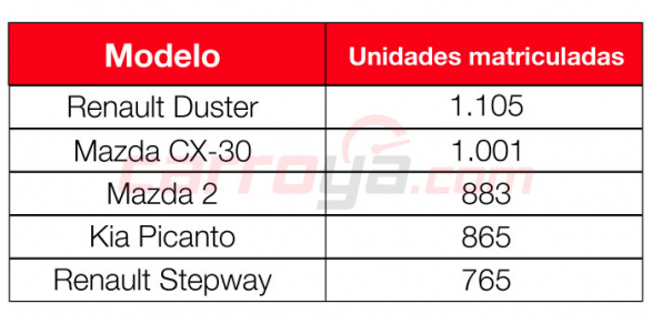 1) Renault Duster: 1.105 unidades, 2) Mazda CX-30: 1.001 unidades, 3) Mazda 2: 883 unidades, 4) Kia Picanto: 865 unidades, 5) Renault Stepway: 765 unidades.