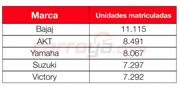 1) Bajaj: 11.115 motos, 2) AKT: 8.491 motos, 3) Yamaha: 8.067 motos, 4) Suzuki: 7.297 motos, 5) Victory: 7.292 motos.