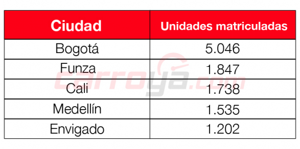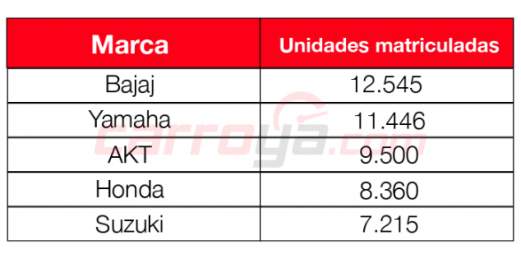 (1) Bajaj: 12.545 ventas, (2) Yamaha: 11.446 ventas, (3) AKT: 9.500 ventas, (4) Honda: 8.360 ventas, (5) Suzuki: 7.215 ventas.