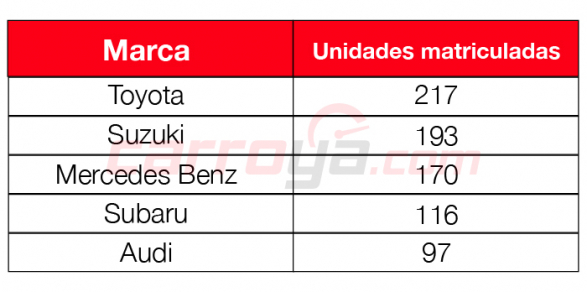 (1) Toyota: 217 matrículas, (2) Suzuki: 193 matrículas, (3) Mercedes Benz: 170 matrículas, (4) Subaru: 116 matrículas, (5) Audi: 97 matrículas.