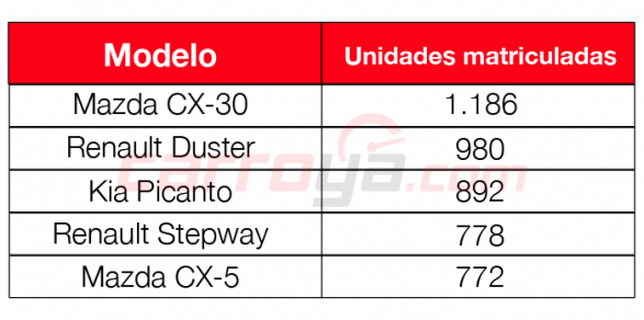 (1) Mazda CX-30: 1.186 unidades, (2) Renault Duster: 980, (3) Kia Picanto: 892, (4) Renault Stepway: 788, (5) Mazda CX-5: 772.