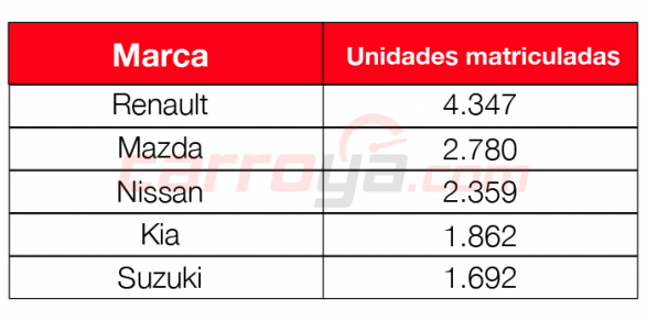 (1) Renault: 4.347 unidades, (2) Mazda: 2.780 unidades, (3) Nissan: 2.359 unidades, (4) Kia: 1.862 unidades, (5) Suzuki: 1.692 unidades.